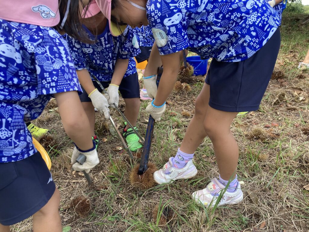 イガを足で踏んで栗を取り出す園児さんの表情は真剣!