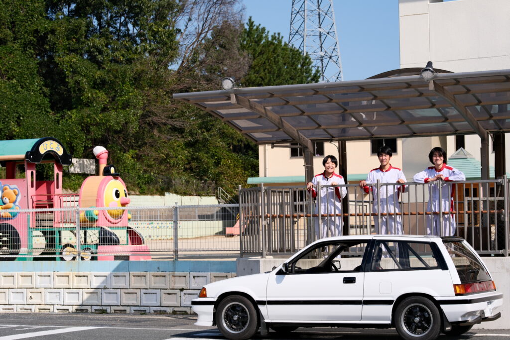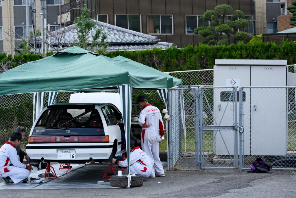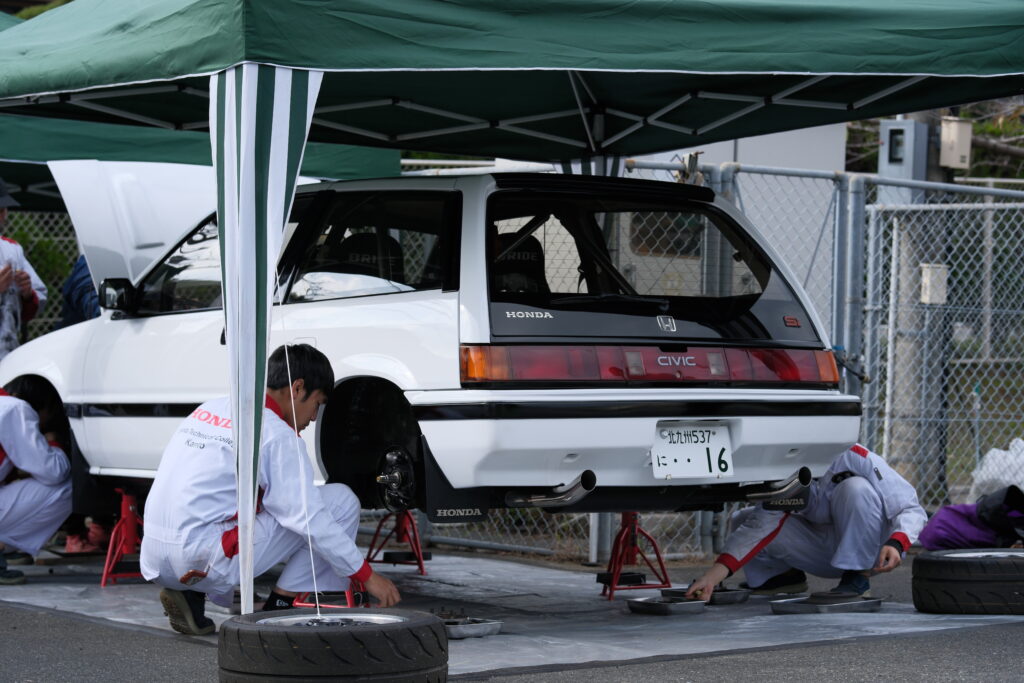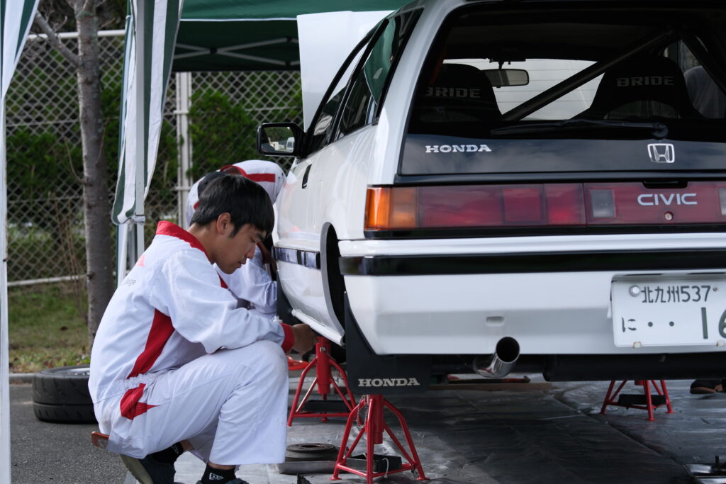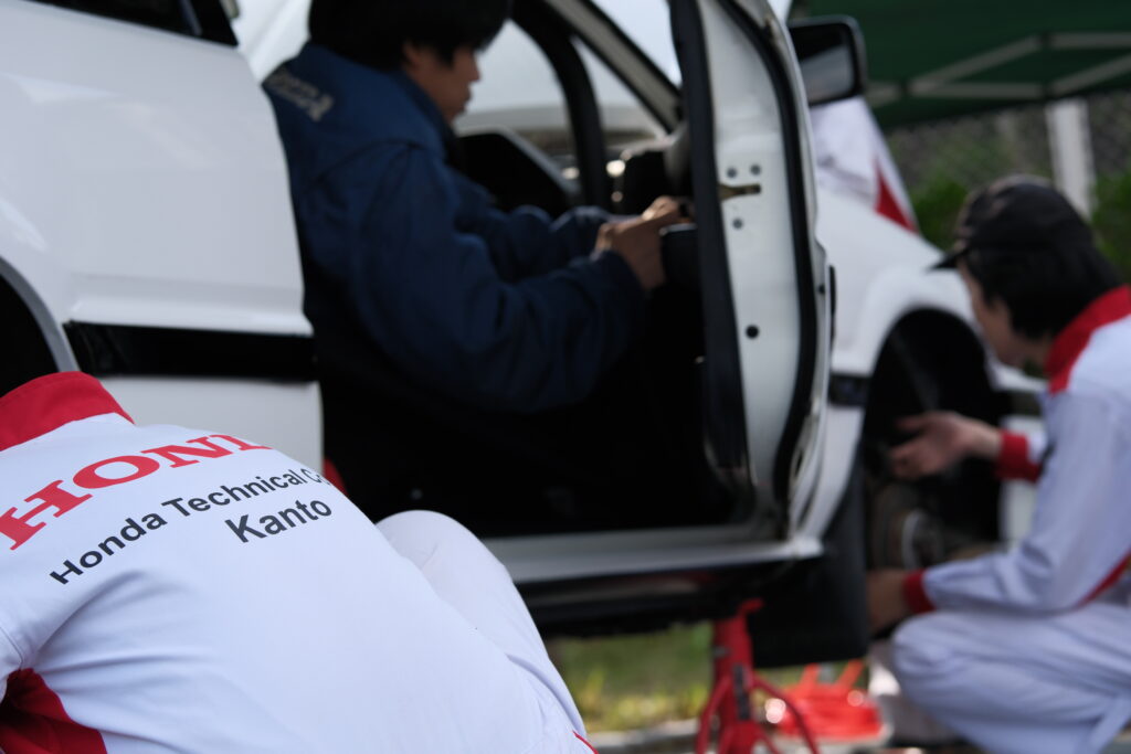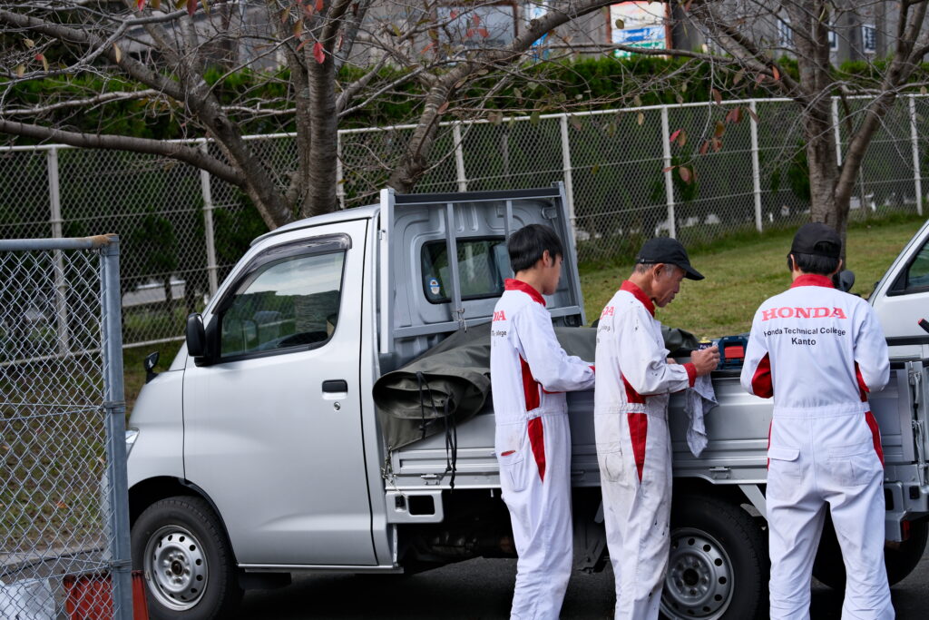 屋外での限られた工具だけでの自動車整備訓練が駐車場で実施されました。