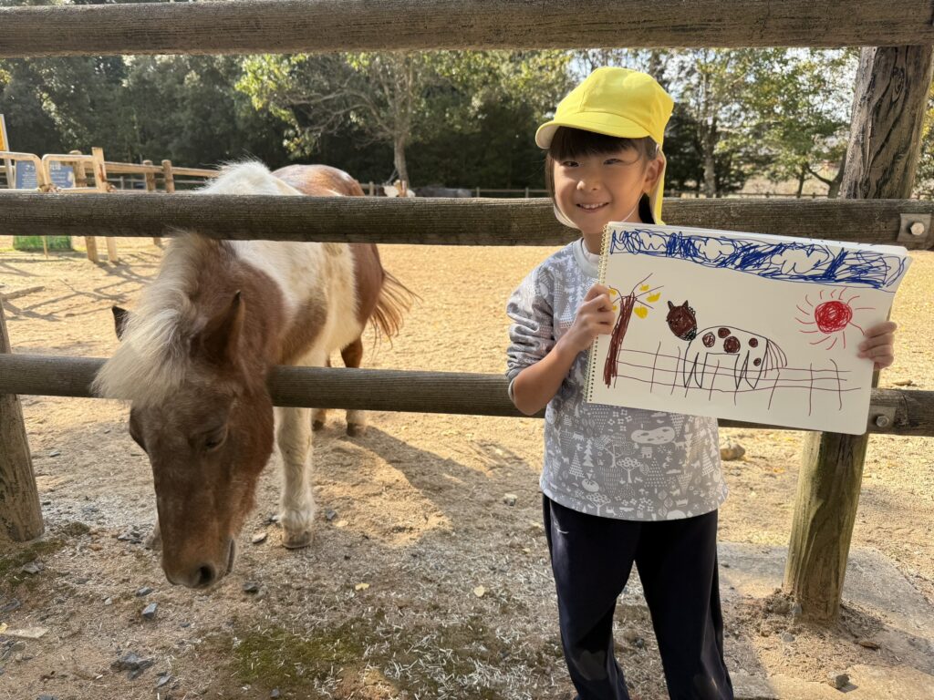 馬やヤギと触れ合い、よく観察してからスケッチスタート!