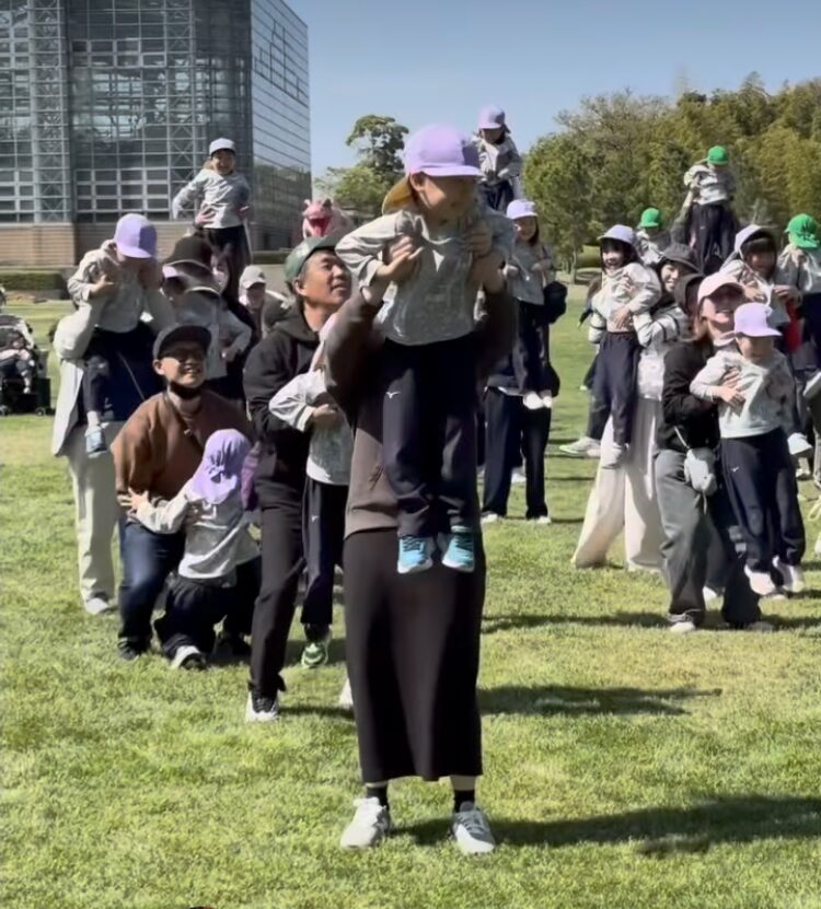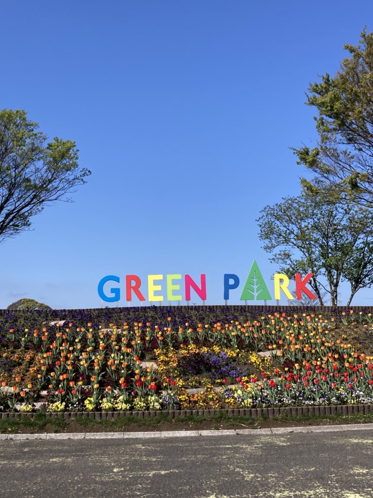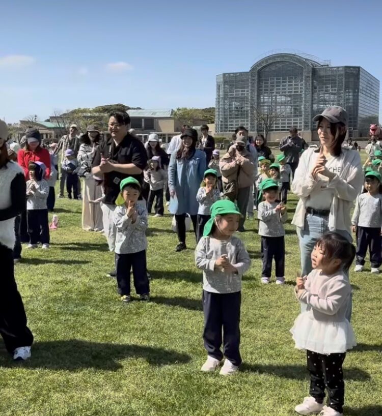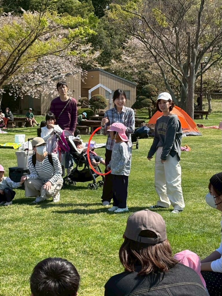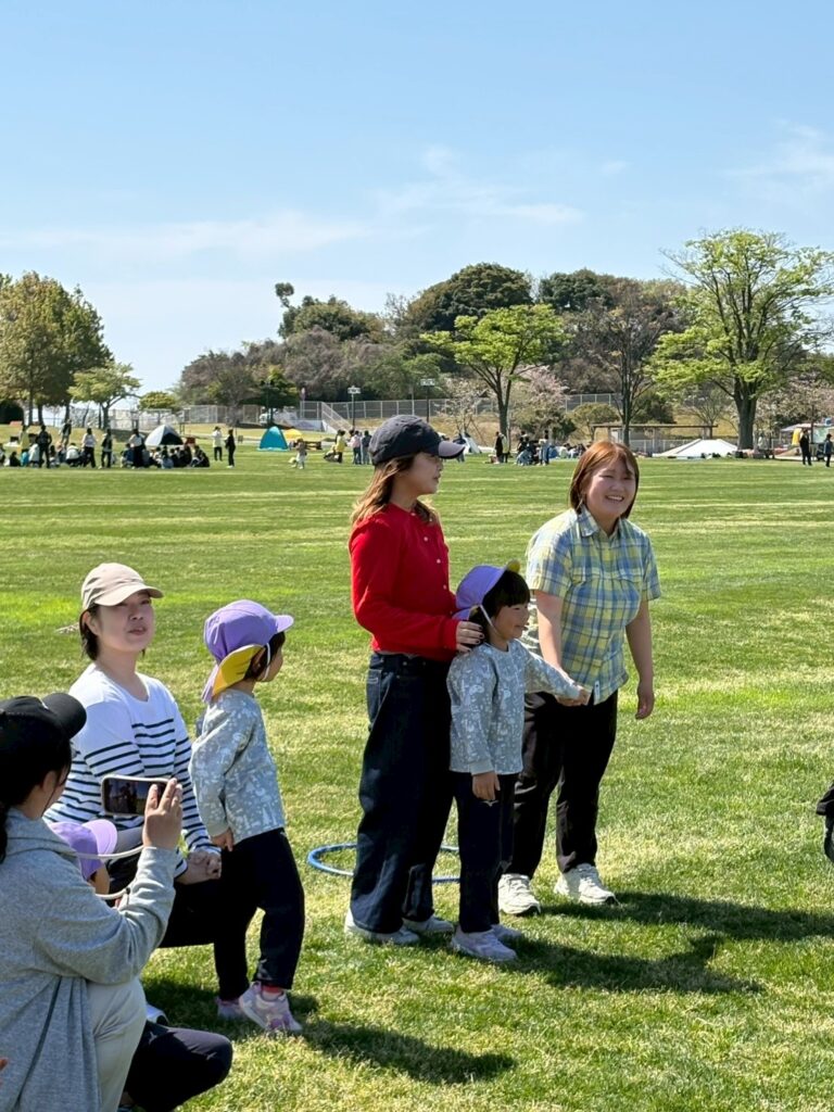 青空がどこまでも広がるグリーンパークで、親子で踊ったりゲームをして体を動かしました。