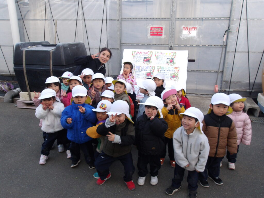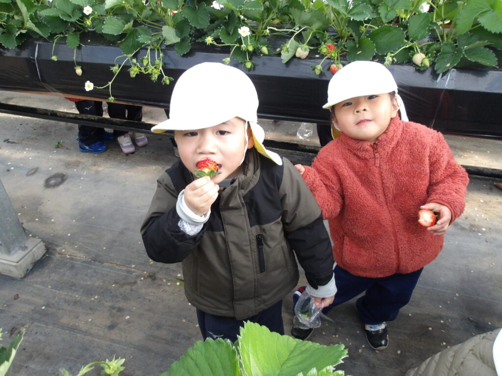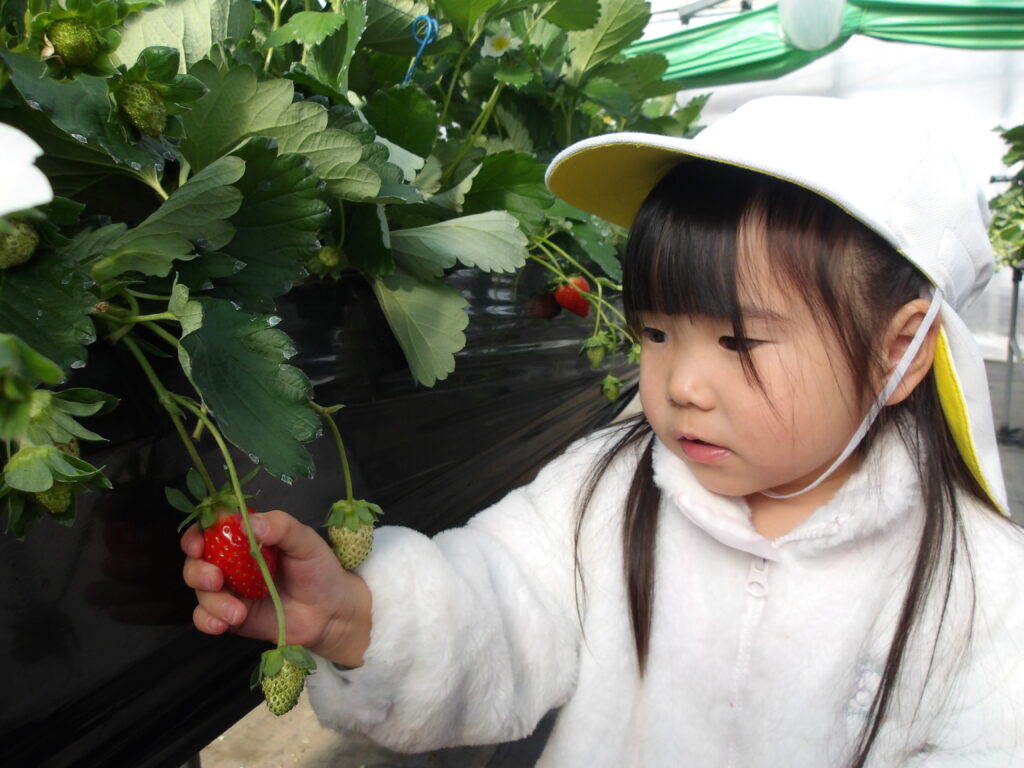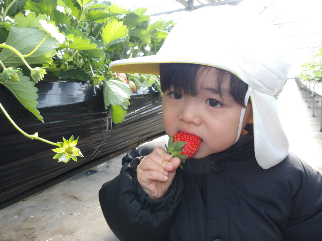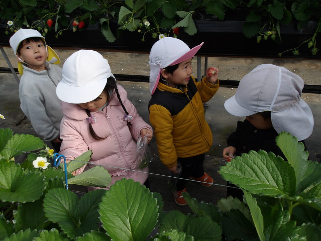 いるか組さんがいちご狩りに行きました。 真っ赤ないちごを見つけると大喜び。 自分で摘んだいちごを食べると「おいしい!」と笑顔いっぱいでした。 小さな手で一生懸命いちごを摘む姿は、とてもかわいかったです♡